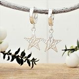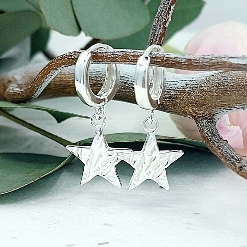 Handmade silver star huggies with a unique frosted texture, giving them a subtle, icy shimmer.